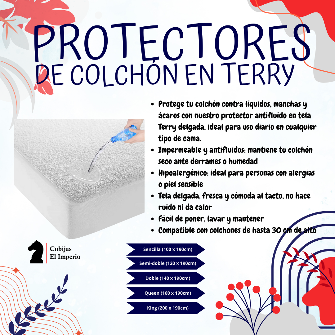 Protege tu colchón contra líquidos, manchas y ácaros con nuestro protector antifluido en tela Terry delgada, ideal para uso diario en cualquier tipo de cama.